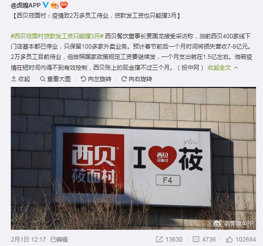 知名餐飲企業(yè)西貝餐飲的董事長在接受采訪時無奈表示,疫情致2萬多員工待業(yè),貸款發(fā)工資也只能撐3月。
