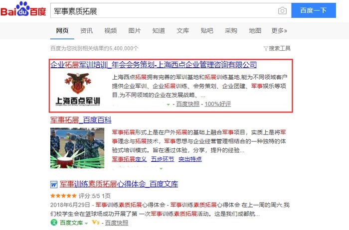 上海西點(diǎn)軍訓(xùn)機(jī)構(gòu)與興田科技合作之后,網(wǎng)站排名提升很快,涉及軍訓(xùn)類的關(guān)鍵詞首頁排名已上千個(gè),給網(wǎng)站帶來了很大流量,提升效果非常好。其中首頁排名第1位的關(guān)鍵詞也有很多,興田科技專注SEO優(yōu)化,7天快速提升網(wǎng)站在百度中的排名。